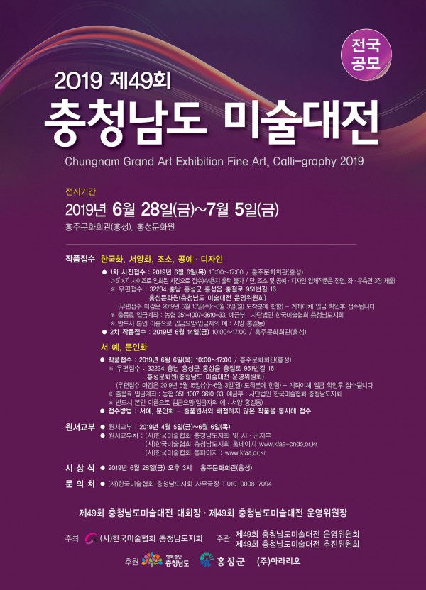 - 2차 작품접수 : 2019년 6월 14일(금) 10:00~17:00 / 홍주문화회관(홍성)