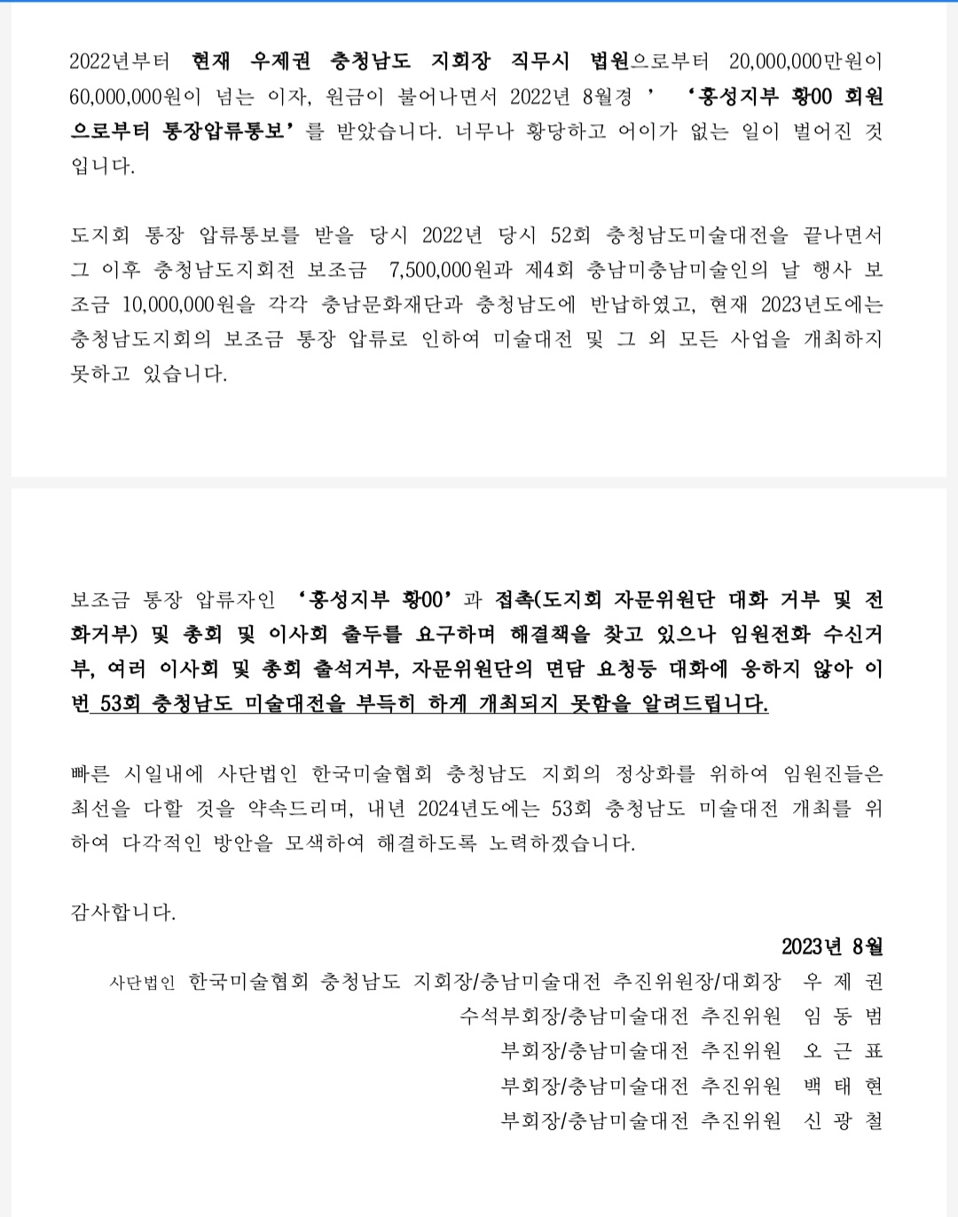충청남도지회의 보조금 통장 압류로 인하여 미술대전 및 그 외 모든 사업을 개최하지