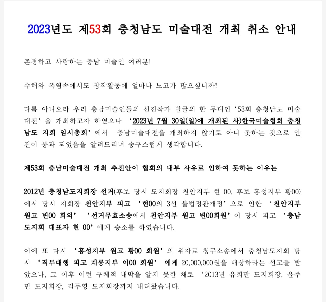 제53회 충남미술대전 개최 추진안이 협회의 내부 사유로 인하여 못하는 이유는